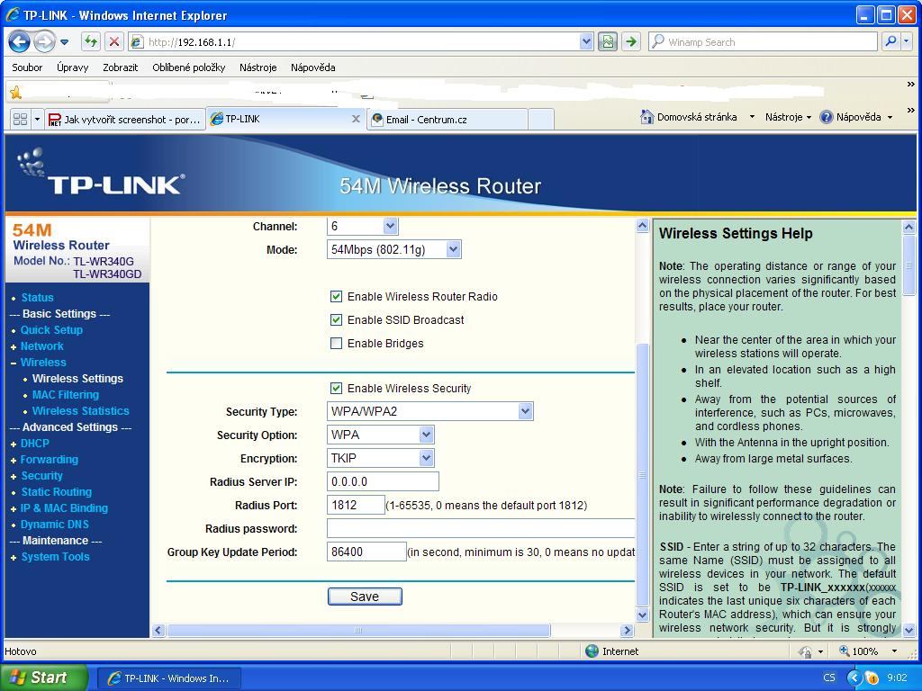 Zdravím, chtěl bych Vás poprosit o pomoc, velkou pomoc. Už je to pět hodin co sedím u počítače a nedaří se mi na to přijít. Mám wifi router typu TP-LINK TL-WR340G, všechno mám správně nastavené, zabezpečení mám WPA-PSK/WPA2-PSK, ale nejde mi se připojit na internet z mobilu. Když se připojím na mou sít píše to že jsem k wifi připojeno, otevře se prohlížeč ale nenačte se. Prosím o velkou pomoc, jestli chcete klidně Vám pošlu info když zadám adresu 192.168.1.1/ do prohlížeče v jakém je stavu. MOC VÁS PROSÍÍM O POMOC.........PROSÍÍÍÍÍÍM:-(