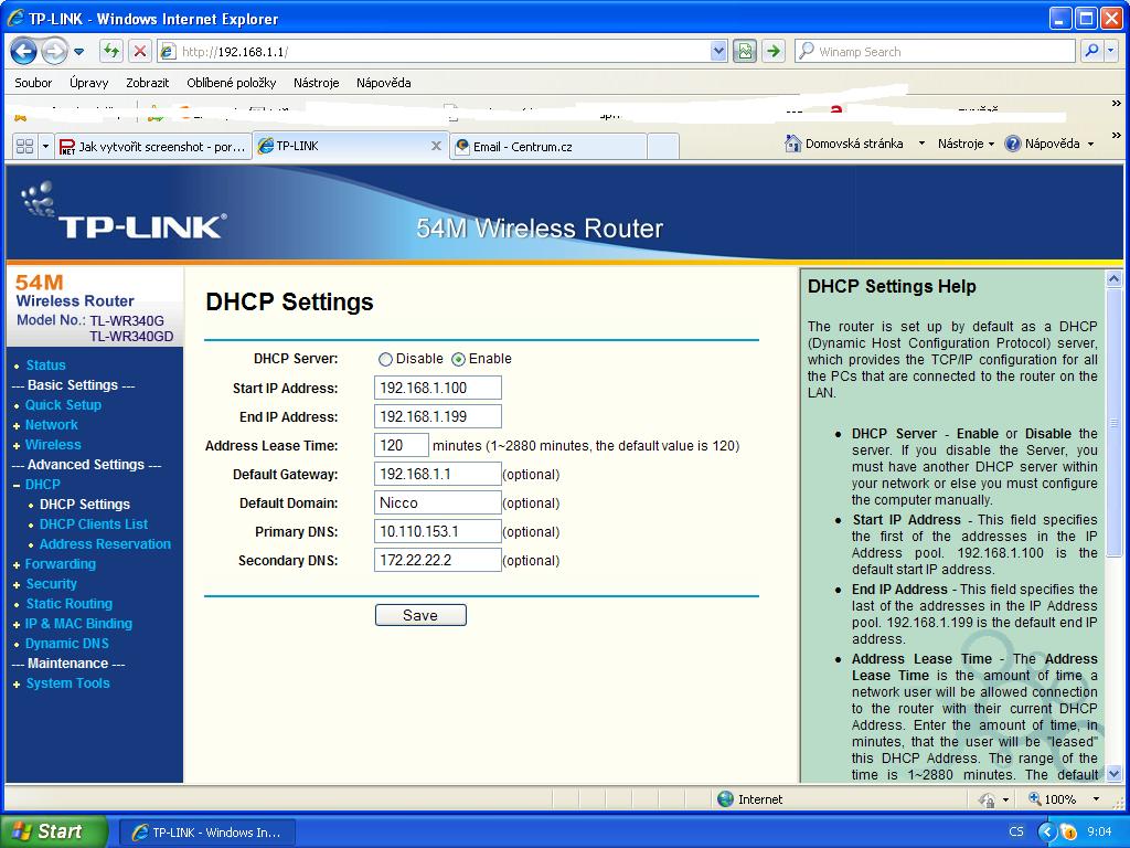 Když zadám adresu 192.168.1.1 do prohlížeče a kliknu na DHCP, pak na DHCP Settings tak tam mám stav…