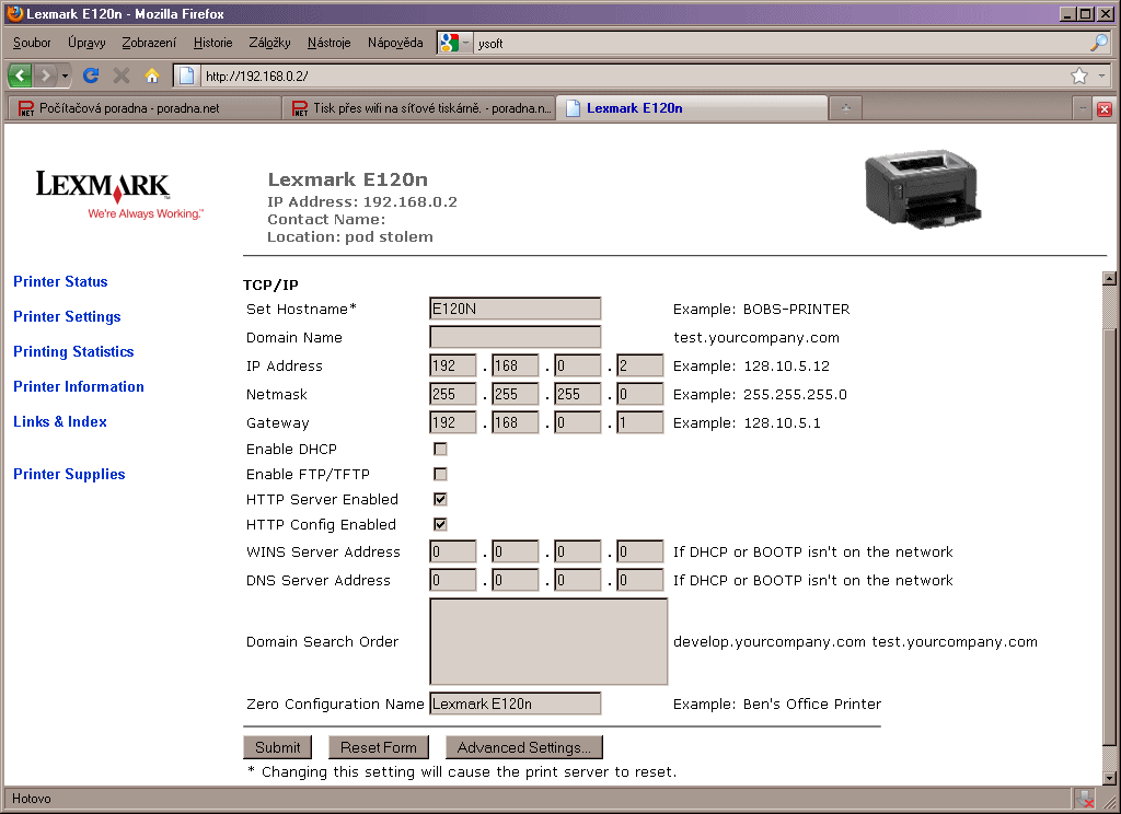 nastavíš ji jednoduše: po zapnutí tiskárna dostane dhcp adresu z routeru, doporučuju nastavit přes její webové rozhraní statickou ip. pak si nainstaluješ ovladač.