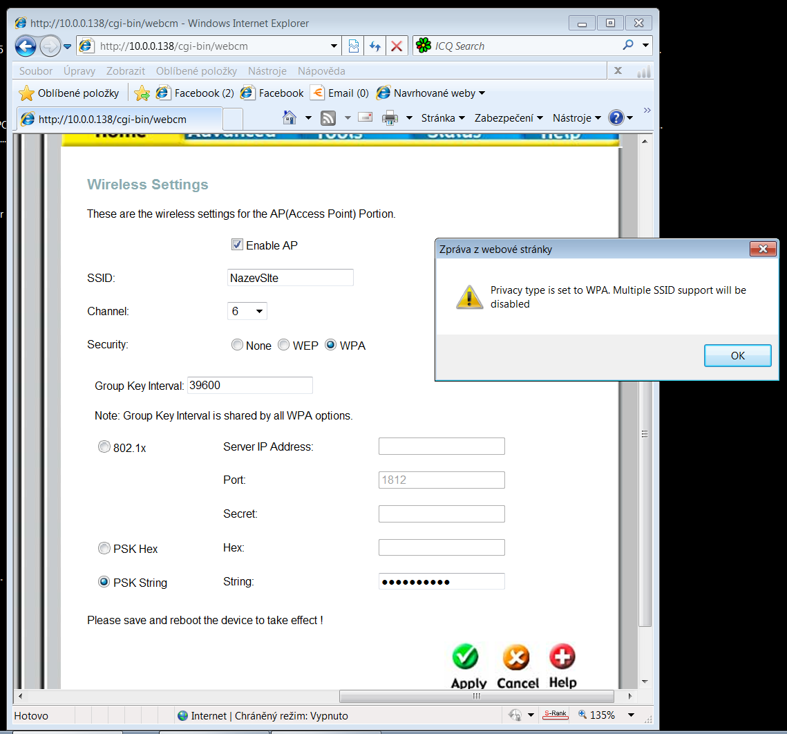 to je OK. Ta hláška říká, že se vypne podpora pro vícenásobné SSID (jedno AP funguje jako více sítí s různými jmény). Mělo by to poté jít normálně uložit dole tím zeleným nesmyslem. Poté ještě nezapomeň uložit konfiguraci (myslím že to je v menu tools).