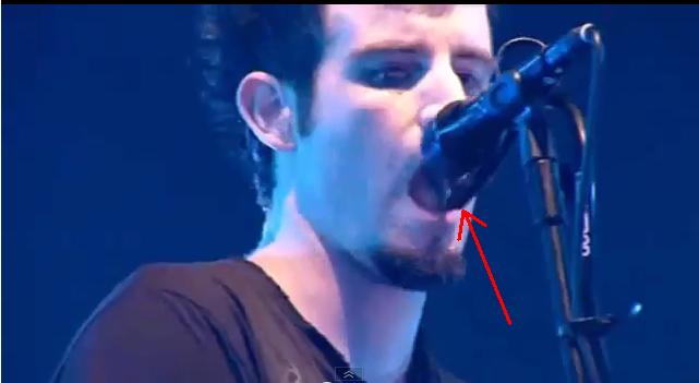 Tohle je ještě 1 sekundu před tím, než začne zpívat, takže tu pusu otvíral proto, aby si tam dal tu černou hadičku (je to dost blbě vidět)
