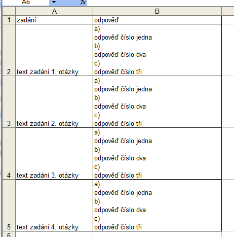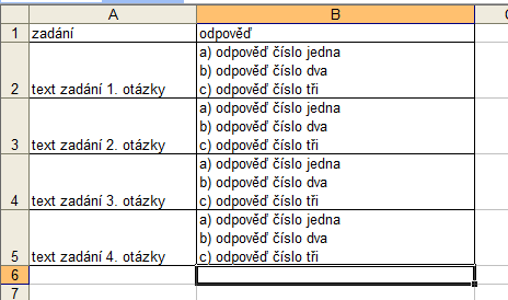 Celý tento text je v jedné buňce a Excel v tomto případě sloužil jen jako pomůcka pro naformátování testovacích otázek pro tisk a následnou výuku a když má tvar podle prvního příkladu, tak to zabírá zbytečně mnoho vytištěných stran. Tzn., že se tam nepoužívají žádné funkce, jen je tam holý text.