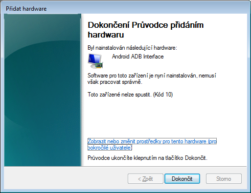 V Android SDK som dal stiahnuť aj USB driver. Po pripojení telefónu k počítaču mi systém hlási, že našiel neznáme zariadenie a pýta si ovládač. Samozrejme najprv ho chce nájsť sám, ale nenájde (ešte som nevidel, aby Windows niekedy nejaký ovládač našiel). Keď mu nanútim inf súbor z USB driveru, ktorý sa stiahol cez Android SDK, tak mi ho odmietne. Keď dám pridať hardvér a tam nanútim tento inf súbor "z diskety", tak kvôli dlhej časovej odozve pri inštalácii to zlyhá. Telefón je celú dobu k počítaču pripojený.