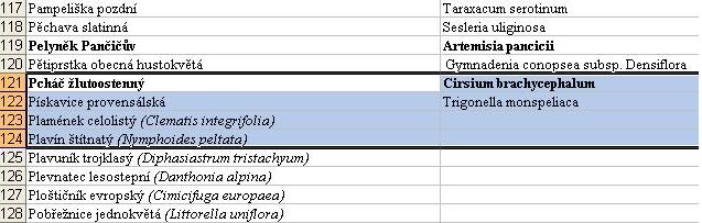 V prvním sloupci mám český a (latinský) název druhů.