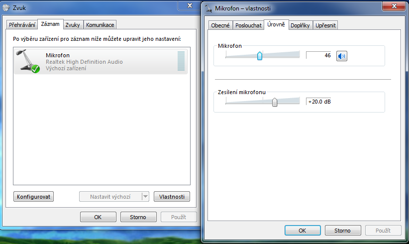 nastavení ve zvucích , mikrofon úrovně nastavit+20dB