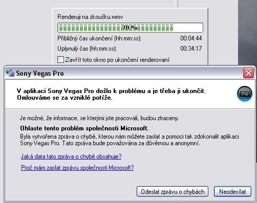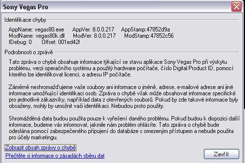 Bylo to prostě něco na způsob: Sony vegas Pro 8 oznámil chybu, a proto tento program ukončil... no a nyní možnosti - odeslat zprávu, neodesílat - a různé odkazy na Microsoft! I když jsem dal odeslat zprávu, vůbec to nešlo. Trvalo to takovou dobu, že jsem to pak zrušil...