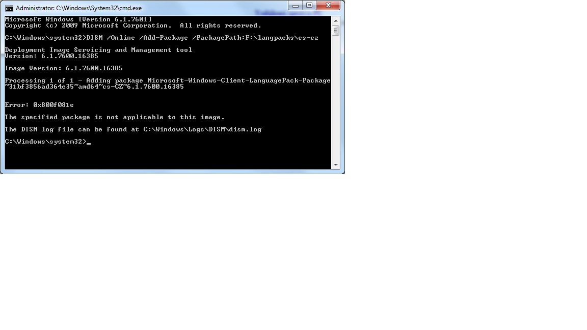 stáhl jsem si z MSDNAA originální Windows 7 Professional x64 s SP1 a MUI pack. Nyní když chci nainstalovat češtinu přez příkazový řádek tak to vyhodí chybu 0×800f081e The specified package is not applicable to this image Co mám tedy dělat? Vygooglil jsem něco o tom, že instaluji češtinu pro jinou verzi W7. Kde bych popřípadě našel tu správnou češtinu?