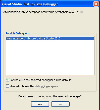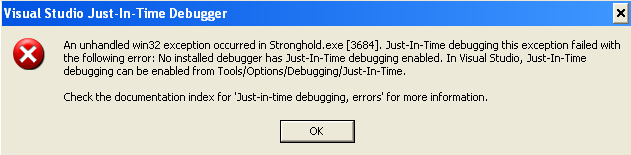 chtěl bych požádat o radu. Po obrovské námaze se mi podařilo asi po roce najít hru Stronghold, kterou jsem později nainstaloval a nějakou dobu hrál. Během hry se mi jednou nebo dvakrát stalo, že se hra zasekla (připadá mi, že hra běží dál, ale jen se sekne obraz) a vyskočilo okno programu Visual Studio 2010 (používám ho k programování v C#) a jeho funkce Just-In-Time-Debugger. Když jsem debugger odmítl, tak se hra vypnula. Po novém spuštění jsem ale mohl hrát bez jakéhokoliv problému dál. Dospěl jsem ve hře dál (konkrétně k misi 14), kde se mi tato hláška objevuje pokaždé v naprosto stejné chvíli. Podíval jsem se do Visual Studia a v nastavení jsem se pokusil debugger nějak deaktivovat. Bohužel jsem našel jen 3 možnosti, které debugger sleduje. Všechny jsem "odklikl" a od té doby se objevuje chybové hlášení. Za malou chvíli Vám přiložím screeny obou hlášek.