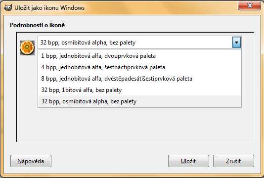 8-bitový alfakanál bude průsvitnost (zamlženost) - má smysl u ikon většího rozměru a minimálně 16mega barev.