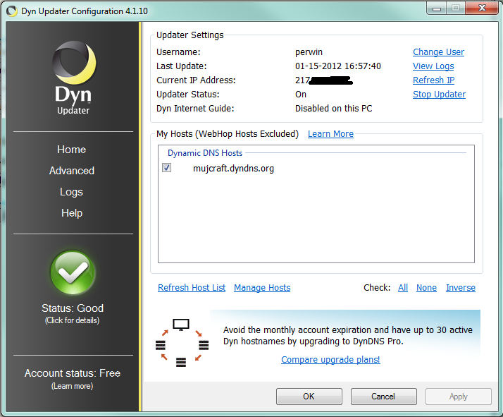 Tak jsem se zaregistroval na dyn.com a založil si Free doménu mujcraft.dyndns.org.