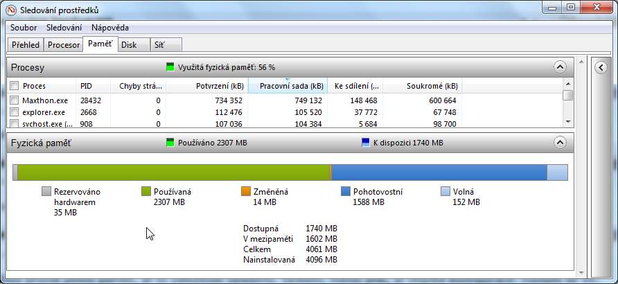 Mám rovnaký problém. Prečítal som si celé vlákno. Skúšal som oba moduly po jednom a fungujú. V msconfig som mal nastavenie pamäte na 2046 MB tak som nastavil maximálnu pamäť na 4092 MB a zlepšilo sa mi to. Pamäť rezervovaná hardwarem teraz je "len" 899 MB čo sa mi ale aj tak zdá dosť. Neviem či je možné to ešte nejak zlepšiť. V podstate vyššie zobrazených 35MB zo správcu úloh - sledovanie procesov asi nedosiahnem. No a mám procesor Q6600, kartu NVidia GF 560 a 4GB RAM (2x2GB). Za prípadnú radu vopred ďakujem.
