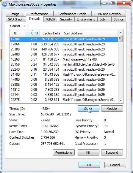 karta vlákna seřadíš podle cpu a vybereš zaseklé vlákno