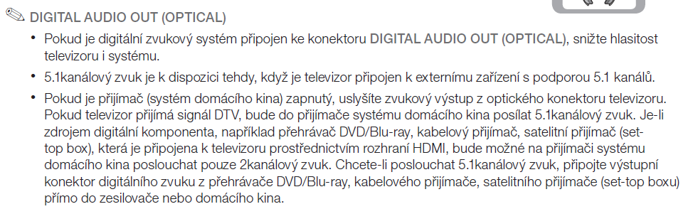 K TV není momentálně připojeno nic (DVD/BR přehrávač, domácí kino, repro), jako zvukový výstp slouží pouze zabudované TV reproduktory (stereo). A právě tady začíná můj dotaz: