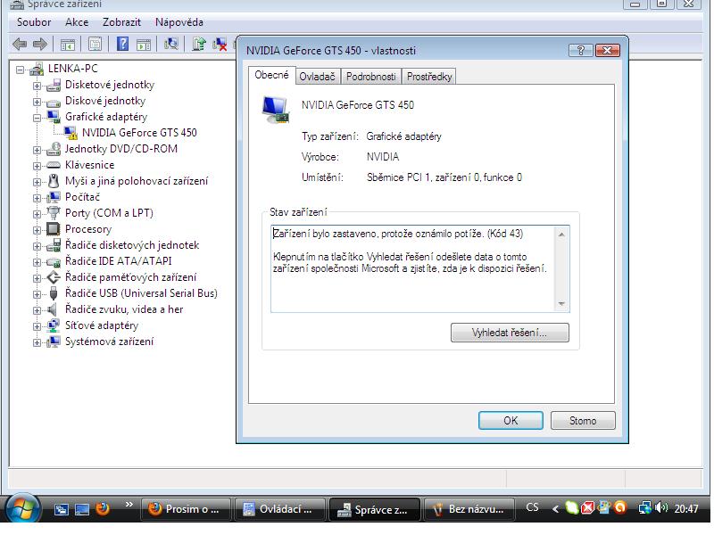 Při zapnutí pc se mi objeví hláška "please reinstal NVida Control panel :( v správci zařízení se mi ukazuje žlutý trojůhelník u ovladače grafického adapttéru a hláška:zařízení přestalo pracovat chyba č.43.Dám reistal "285.62-desktop-win7-winvista-32bit-international- whql"s restartem a je zas vše v pořádku do dalšího zanutí pc.Reinstalovala jsem celý systém a chvíli to šlo a ted zas,už nevím co s tím:(Moc tomu nerozumím a děkuji předem za radu:-*
