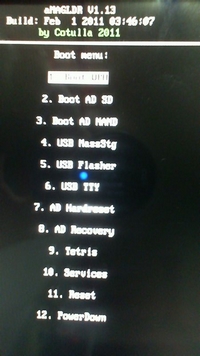 3) Pokud je mi známo, tak v případě použití Androidu na HD2 se nejčastěji používá MAGDLR. Zkusme - restartuje telefon a po probliknutí loga by se měl zobrazit MAGDLR, který bude načítat Android (černá obrazovka s textem, v záhlaví je napsáno aMAGDLR...). Ihned po naskočení této obrazovky, ještě než se začne v okně něco vypisovat, podržte tlačítko napájení (úplně vpravo). Měl byste se dostat sem: