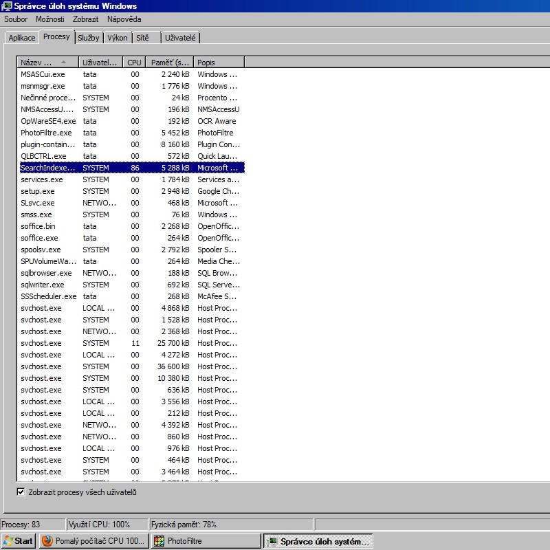 A protože u všech (zatím) zobrazených procesů je vytížení přiměřené, dozvíš se to až po kliknutí na "zobrazit procesy všech uživatelů".