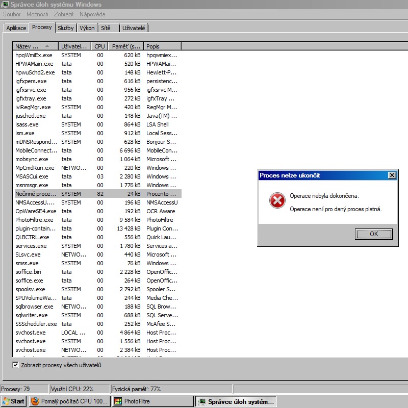 Nejdříve musíš zjistit, který proces bere 100% výkonu procesoru.
