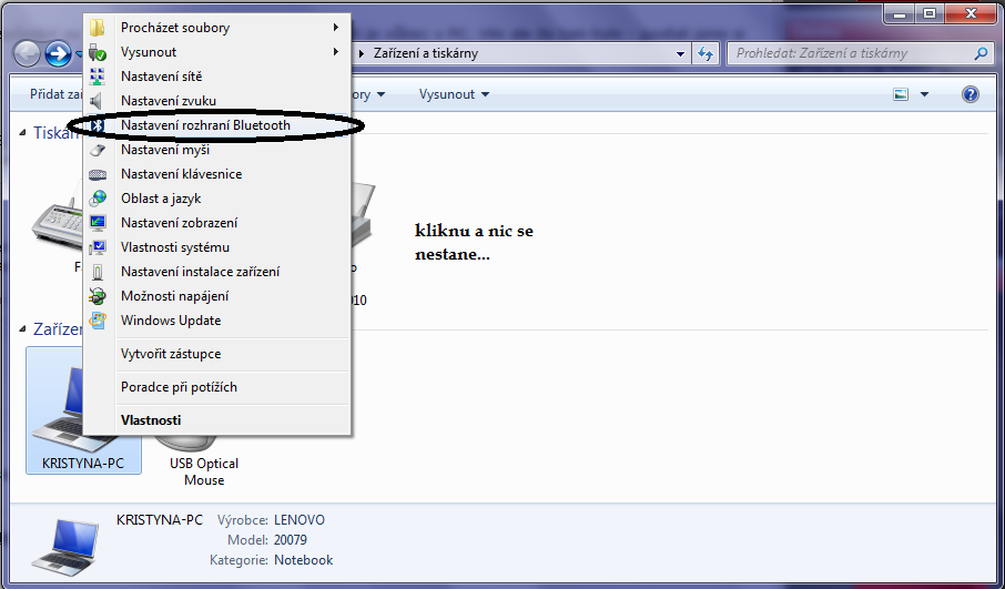 Ono tam to bluetooth právě není... V přizpůsobit se mi vůbec neoběvuje - ani nevím jestli je vůbec v PC. Vím ale že tam bylo - posílali jsme si obrázky z mobilu do PC.