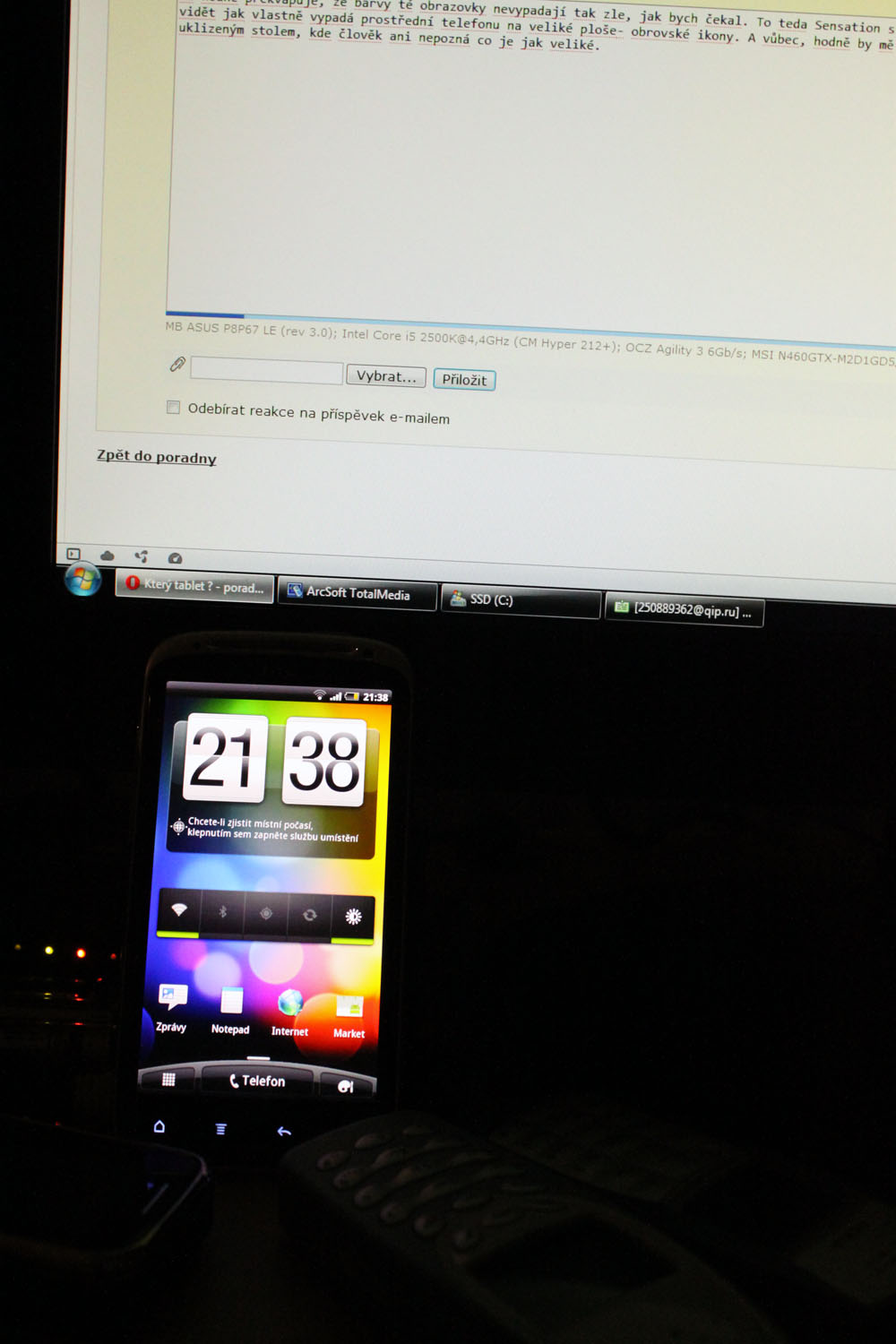 Mě hodně překvapuje, že barvy té obrazovky nevypadají tak zle, jak bych čekal. To teda Sensation s mnohanásobnou cenou na tom není o moc líp. Ale díky moc za tu fotku, konečně je někde pořádně vidět, jak vlastně vypadá prostředí telefonu na veliké ploše- obrovské ikony. A hodně by mě potěšilo, kdyby sem dávali lidé právě takové fotky, není to typická fotka u recenze s perfektně uklizeným stolem, kde člověk ani nepozná co je jak veliké.