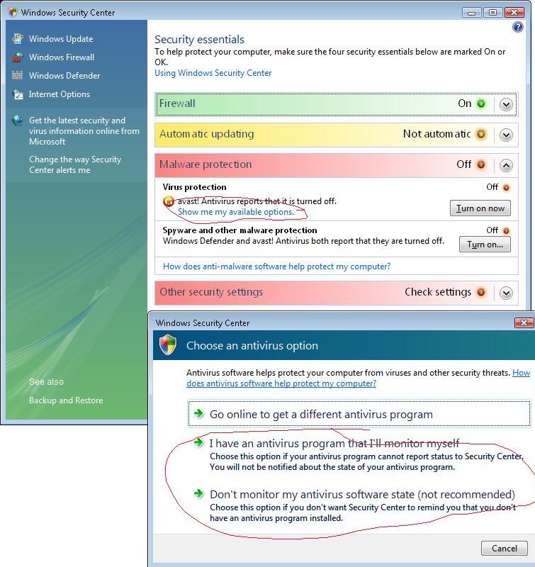 myslim, ze tam vlevo, jak si to odsekl z printscreenu bys mel mit nejakou kolonku na nastaveni, co chces aby to kontrolovalo, tak odskrtnes antiviry a uz nic vyskakovat nebude. (nemam pred sebou Visty, ale snad tam to nastaveni take je)