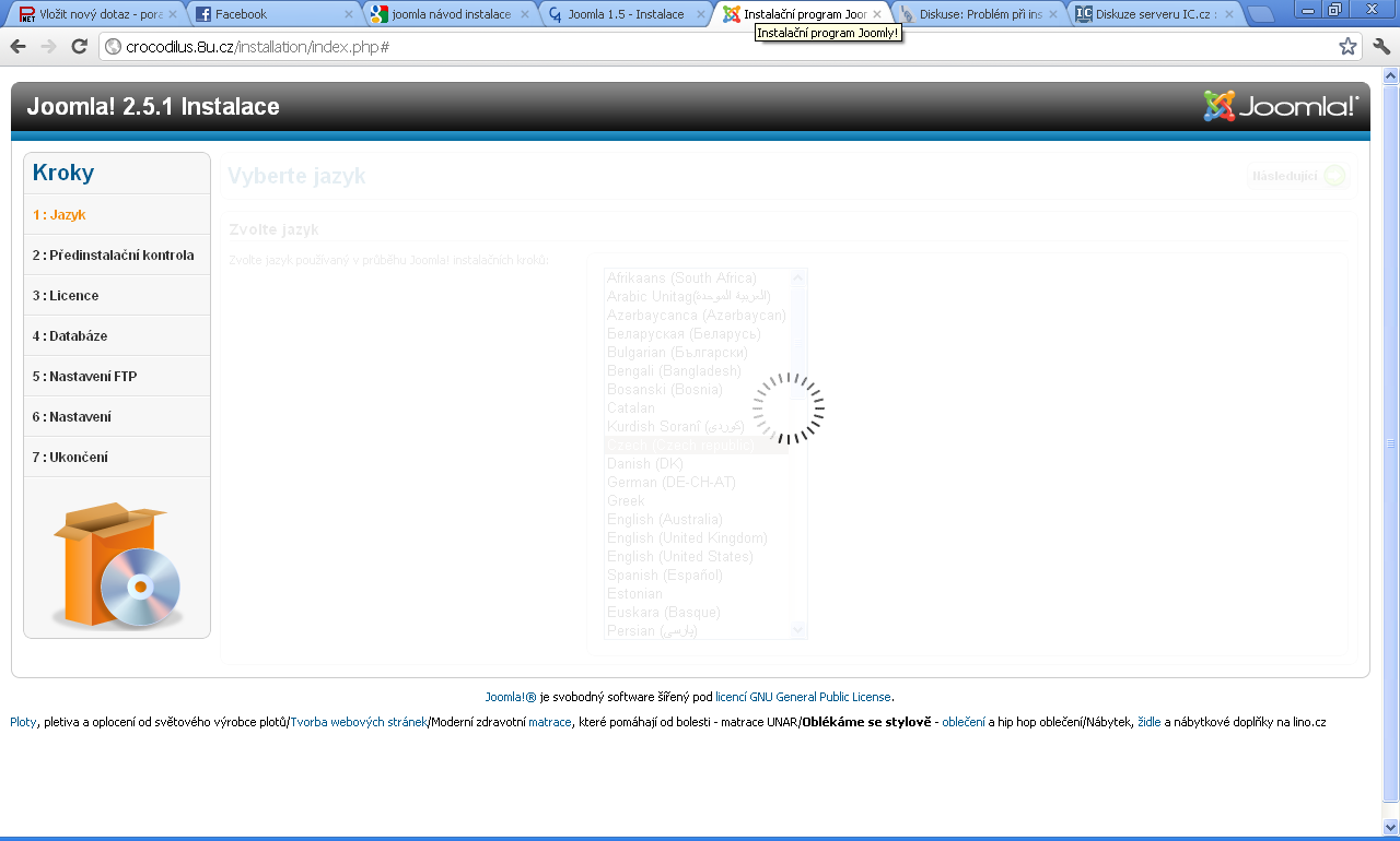 Snažím se nahodit na free hosting enodra.cz joomla 2.5.1 protože WP mi nevyhovuje. Stáhnu kompletní balík joomly, rozbalím na C:/ a pak nahrávám přes total commandera na FTP. Po nahrátí jsem označil vsjo na efTýPýčku na 777 a po spuštění instalace odkliknu jazyk češtinu.