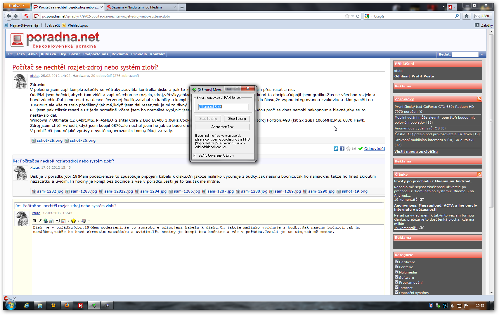 Dnes seknutí PC při Aimpu a Firefoxu,programy neodpovídaly.Po resetu (obr1).Dostal jsem se do Biosu,…