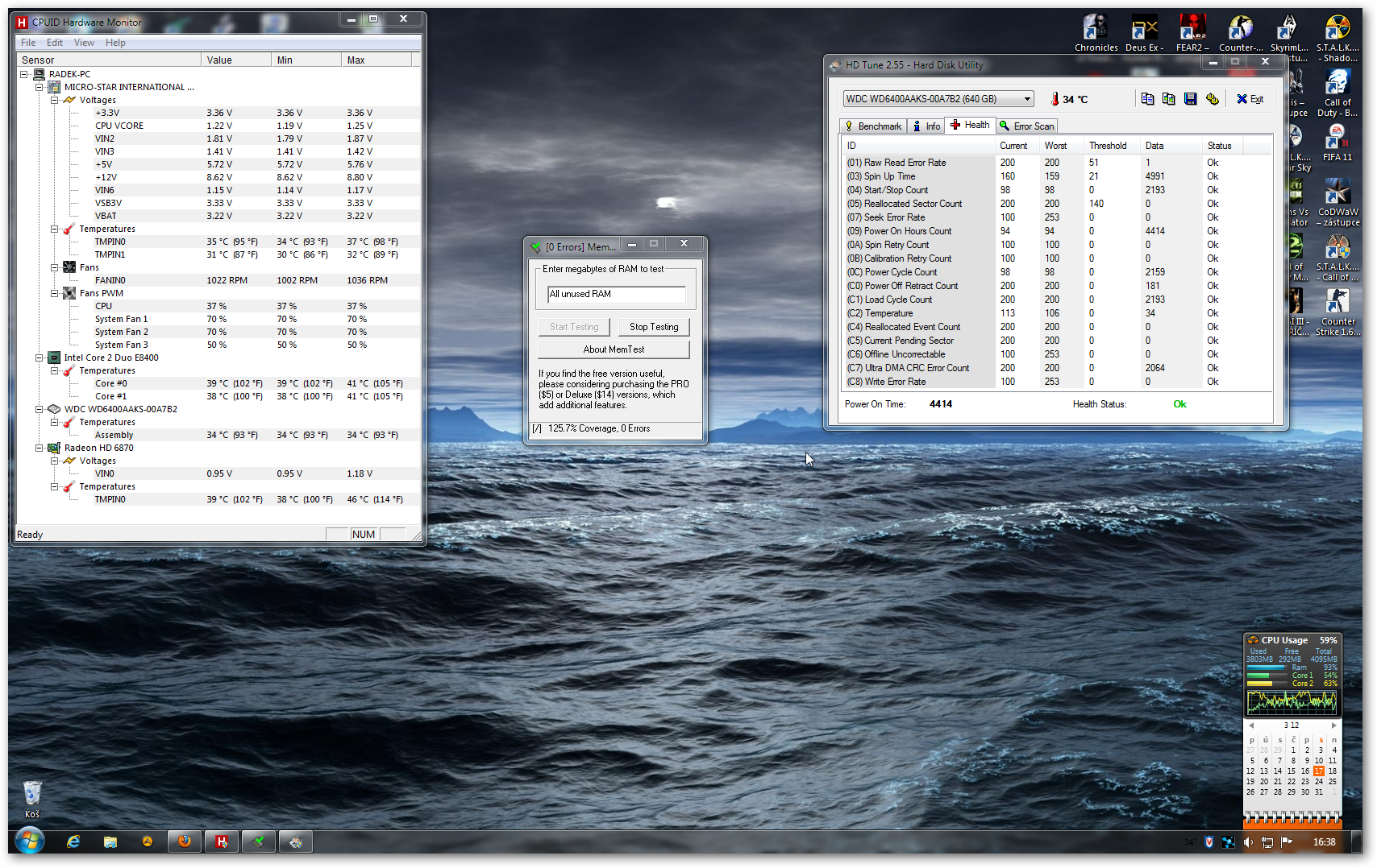 Disk je v pořádku(obr.19)paměti vypadají taky(obr.20)Mám podezřeni,že to zpusobuje připojení kabelu k disku.On jakože malinko vyčuhuje z budky.Jak nasunu bočnici,tak ho namáčknu.Takže ho hned zkusím zkroutit nazačátku jakože do pravého uhlu a uvidím.Tři hodiny je kompl bez bočnice a vše v pořádku.Jestli je to tím,tak mě mrdne.