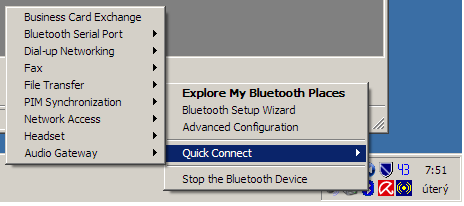 Pokud tomu tak není je třeba nainstalovat ovladač, jehož součástí je jednoduchý, obslužný program, alespoň, jak si pamatuji, u ovladače Widcomm a nebo Blue Soleil tomu tak bylo.