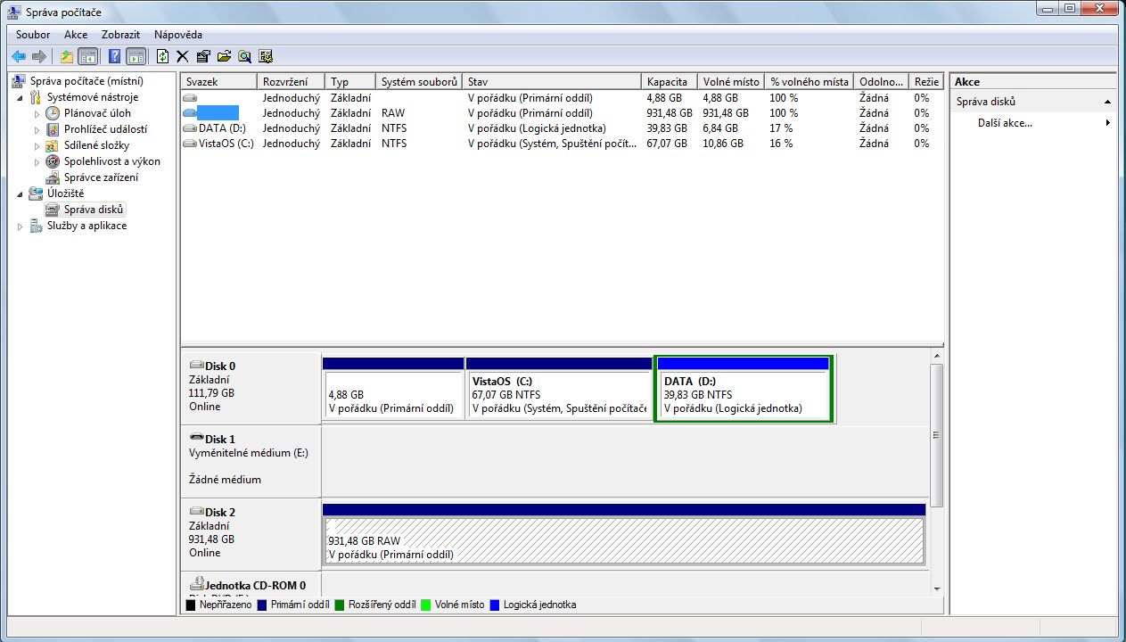 Ve správě disků se u něj zobrazuje co?