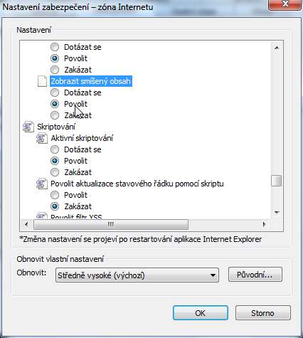 zkus: možnosti internetu zabezpečení zóna internet vlastní nastavení povolit smíšený obsah [8747-sm…