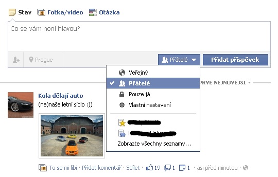Dobrý večer.Mám takový problém na facebooku.Moje příspěvky na cizí zeď prostě nejsou vidět,bude to určo někde v nastavení,včera jsem se po celodenní lopotě nějak dobral k tomu,aby to šlapalo(někde v nastavení soukromí jsem změnil přátele na veřejný),dnes to ale opět nešlo,vlezl jsem tedy tam,jak včera,ale oni to nějak změnili,nebo co a totálně jsem se v tom ztratil.Neví někdo,co nastavit,aby si můj příspěvek na cizí zeď mohli přečíst i ostatní,takhle ho vidím jen já a to ještě,když jsem přihlášený.Děkuju moc za každý podnět,protože mi z toho už hrabe