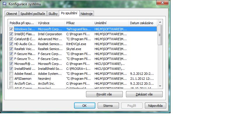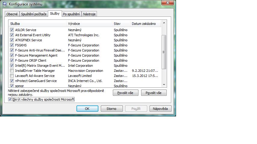 Potom všechny položky po spuštění vypni a dále všechny položky ve službách (se zatrženou volbou skrýt "všechny služby ...") vypni (jasný?! žádný ms nebudeš vypínat!). Následně restart pc. (Za tuto radu asi schytám pár nadávek, protože radím vypnout služby, které ani nevím co jsou, ale zase to lze vzít zpět, když by něco přestalo fungovat - například teď nebude fungovat Windows defender, a ten by bylo asi vhodné vypnout i ve službách u ms)