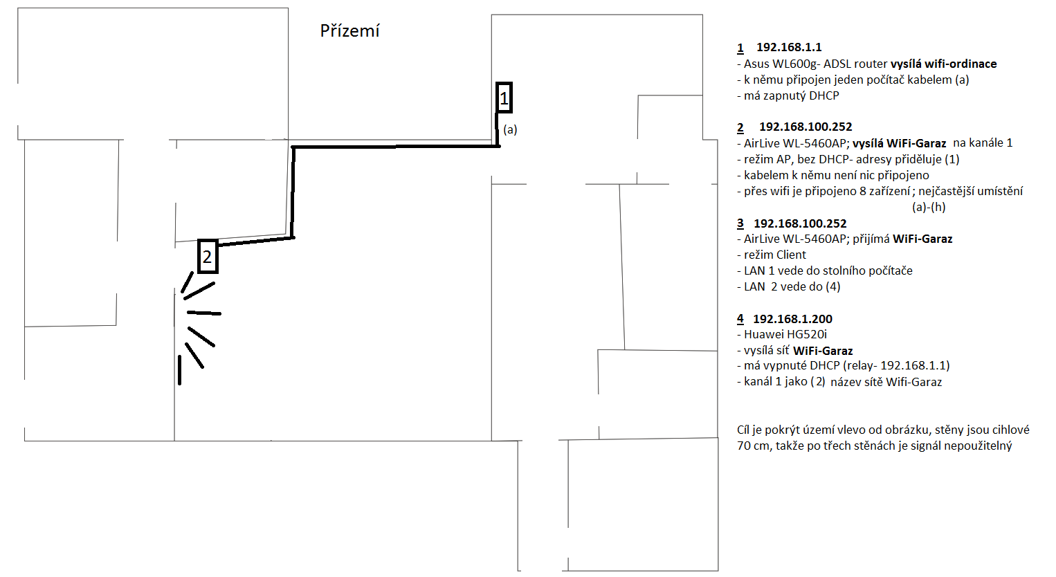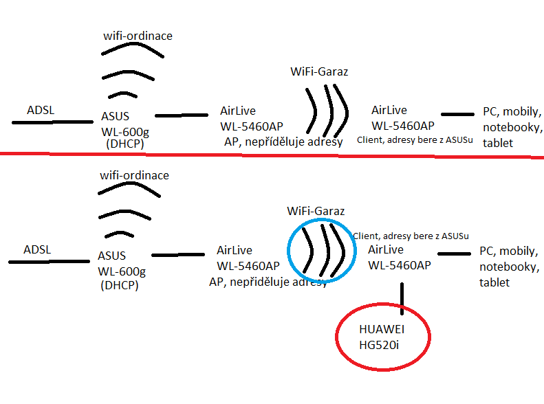Síť "WiFi-Garaz" vysílaná z AirLive WL-5460AP má na zahradě velmi slabý signál, u mě v pokoji s výhledem na zahradu je ale signál velmi dobrý. Chci rozšířit dosah Wifi-Garaz, repeater se mi jako řešení nelíbí. Asus má IP 192.168.1.1. V nastavení Huawei jsem udělal následující změny: změnil jsem jeho IP na 192.168.1.200, DHCP jsem přenastavil na "relay" s cílem 192.168.1.1 (Asus), síť jsem pojmenoval WiFi-Garaz, nastavil jsem stejné zabezpečení a stejné heslo.