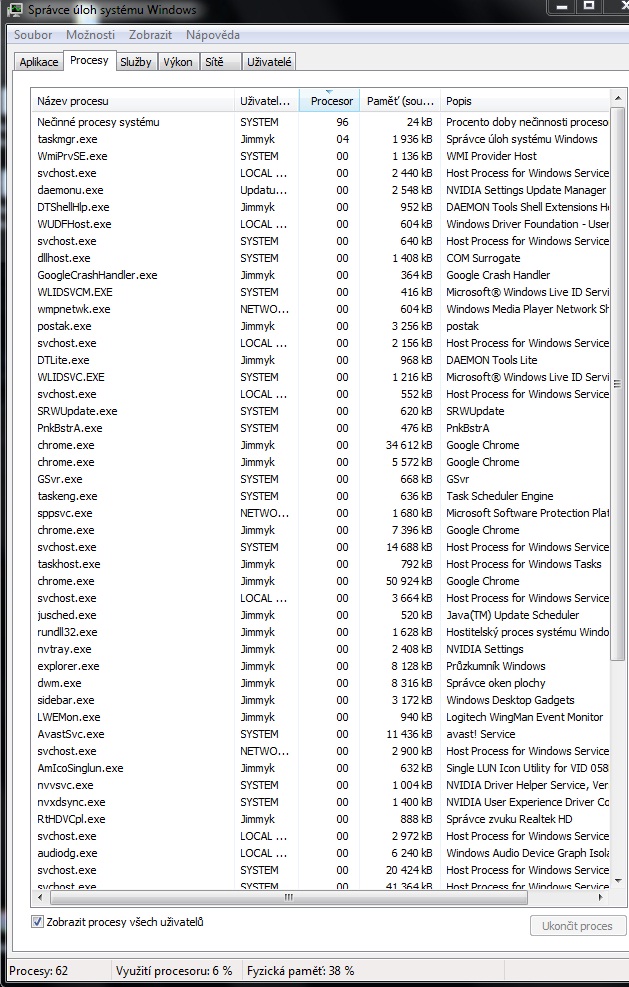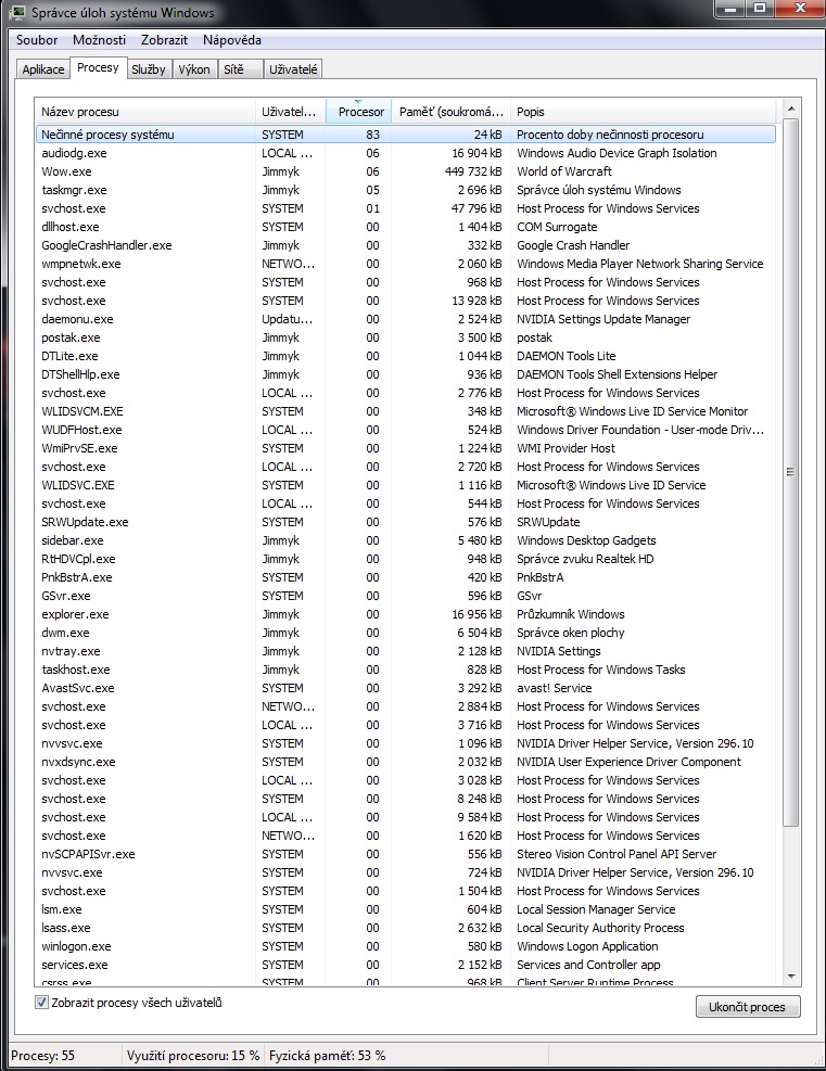 Jaké je vytížení procesoru a který proces to nejvíc vytěžuje?