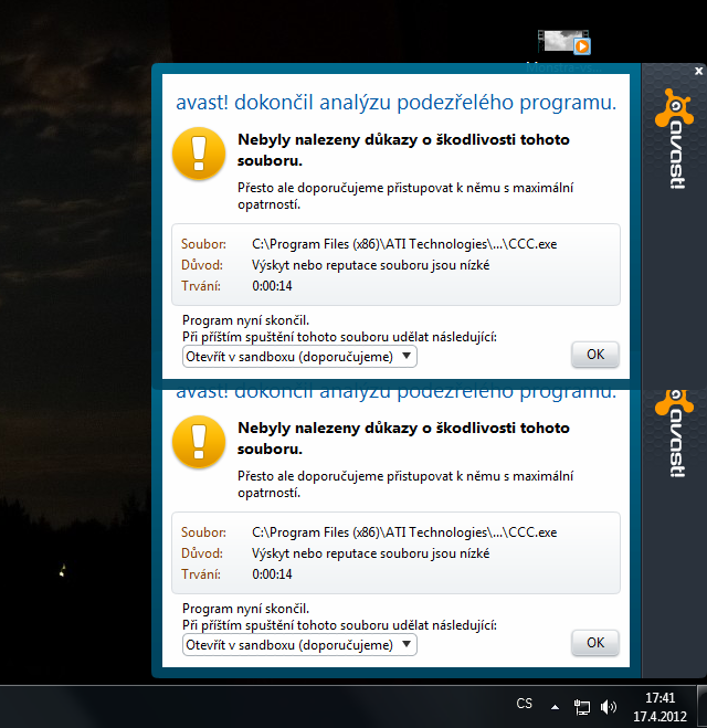 A ked najde aj najnovsia verzia avastu vir v ccc.exe, a ak mas aj najnovsie ovladace pre graficku kartu, tak v tom ccc.exe nejaky vir je, ptz ccc.exe ma v PC miliarda ludi (ovladace ATI grafik) a v tom urcite ziaden antivir nehlasi falosny poplach, to by v tom momente vyrobcu antiviru zavalilo 10 milionov emailov ze co to ma byt. Takze najnovsi avast a ked pise aj ona ze v ccc.exe je vir tak je to zavirene.