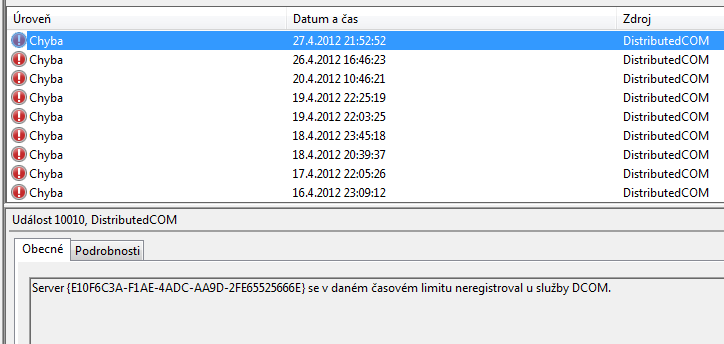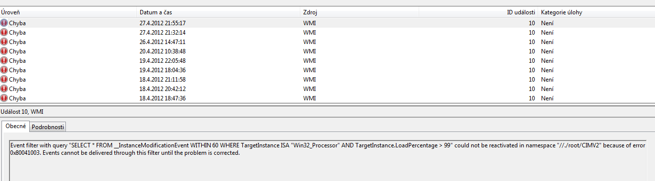 a jen jsem se podíval do prohlížeče událostí a zase nějaké chyby