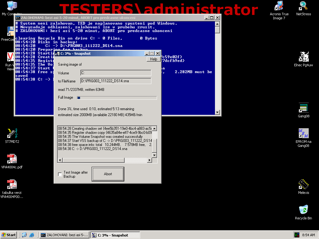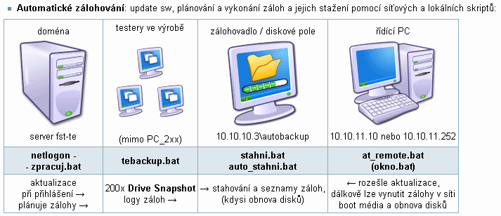 při přihlášení testeru do domény proběhne aktualizace pokud je třeba, případně se podle stáří spustí nová záloha - ta odešle log na nas. na něm běží plánovač, co týden podle logů ty zálohy stáhne, a přibalí k tomu stručný výpis hw a sw ať víme co ta stanice je zač.