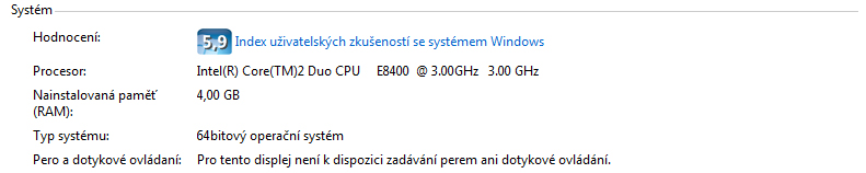 Nainstalovaná paměť: 2,00GB (použitelné:1,85GB)