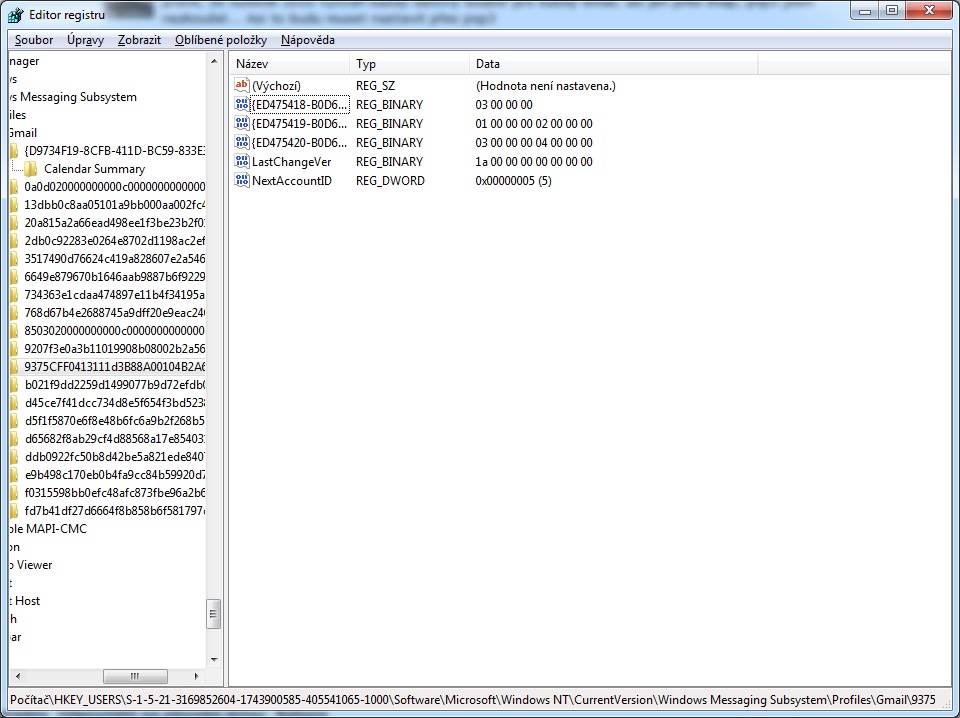 Pod klíčem 9375CFF0413111d3B88A00104B2A6676 by měly být další pod klíče typu 00000001, 00000002, ... V těchto je teprve nastavení účtů. Čísla nemusejí být v řadě, pokud byl účet z profilu odebrán a přidán nový. Možná bude lepší udělat export a dát ho sem.
