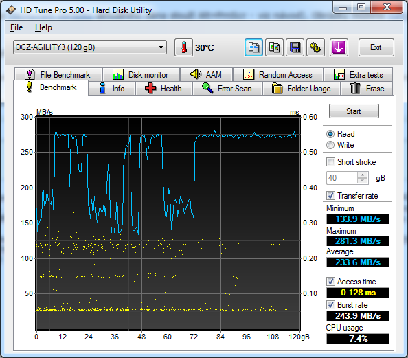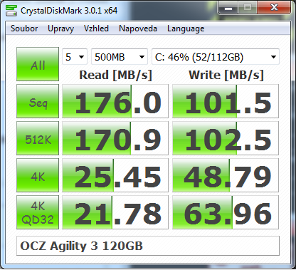 Udělal jsem na něj čistou instalaci 64 bitových Windows 7, vše fungovalo skvěle, změna rychlosti byla hodně výrazná. Nedávno jsem si začal uvědomovat, že už mě práce s plotnovým diskem ve škole a na notebooku nevytáčí tak, jako dřív, tak jsem udělal test rychlosti. Nastalo zděšení. SMART tvrdí, že je disk naprosto v pořádku, zabráno mám 52GB ze 112. Na disku je pouze systém a programy. Hry a data mám na plotnovém disku.