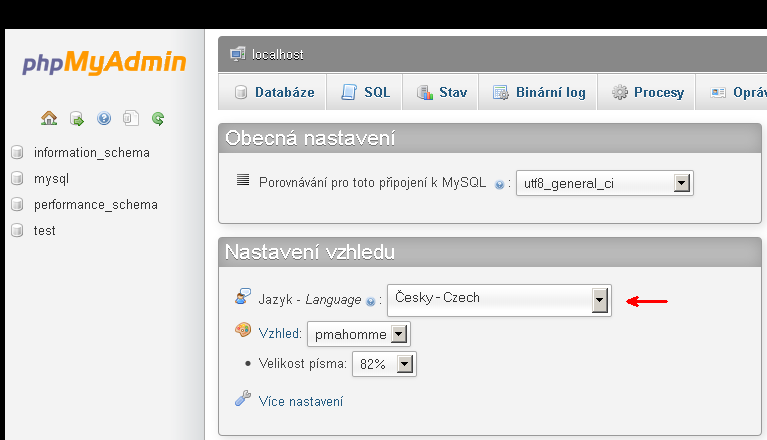 Nevím jak ty, já mám výběr jazyka přímo na úvodní stránce phpMyAdmina. poslední
