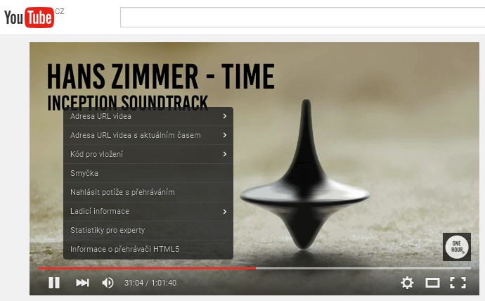 Klikam do okna videa. To menu, co se mi objevuje, se objevuje jak v mozill, tak v chromu, ma ale, samozrejme, jinou grafiku, nicmene polozky jsou tytez. Zadna nabidka, pokud jde o flash a vypinani akcelerace.