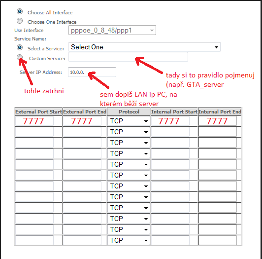 Zdravím, snažím se rozjet vlastní server pro server hry GTA. Server mám stažený a nastavený na port 7777. Nevím ale, jak nastavit forwarding u routeru, zkoušel jsem spousty kombinací parametrů a server nikdy není přístupný internetu. Dávám sem screen příkazu ipconfig a screen z nastavení routeru. Může mi prosím někdo říct, jak přesně to mám v nastavení routeru vyplnit? Statickou Ip adresu samozřejmě mám.