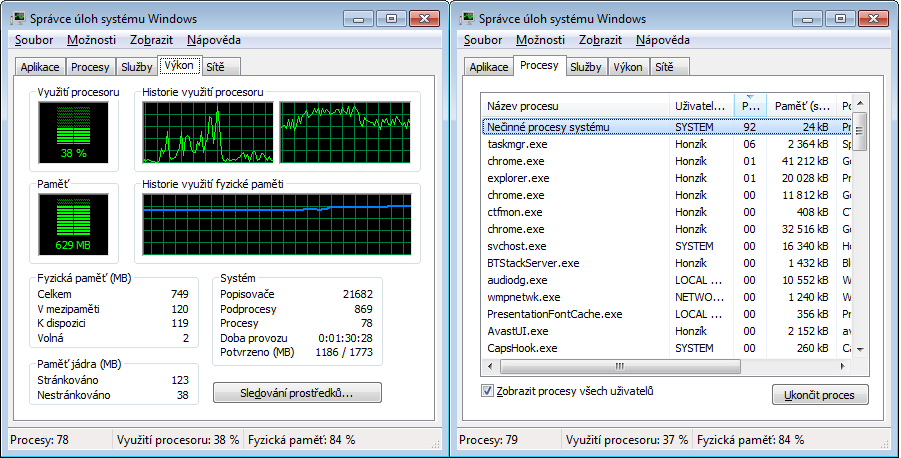 jdu na tu odinstalaci, takže to mám nechat bez antiviru? Zmáčkl jsem tlačítko obrazit všechny procesy tam jsou i systémové, ale opravdu tam nic neskáče, občas svchost měl 30% ale to tak 2 minuty a od té doby nic a procesor jede a jede. nečiné procesy systému 96% a využití cpu 40%, přikládám obrázek
