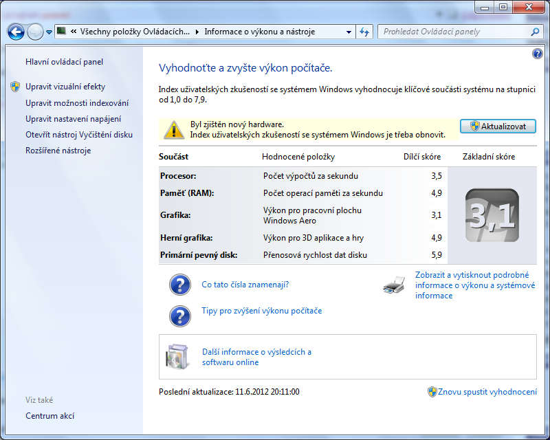 Tady máš hodnocení obou pc pro zajímavost, ale podle mě na tom Aeru se nezapne ten ION2 tak je to hodnocení tak malé. Jde mi jen o to, že nechápu proč to píše, že byl zjištěný nový hardware a je potřeba aktualizovat index. Když to udělám píše to to stejné - nedělá to náhodou ta grafika, která není zaplá? Je to jen ze zvědavosti