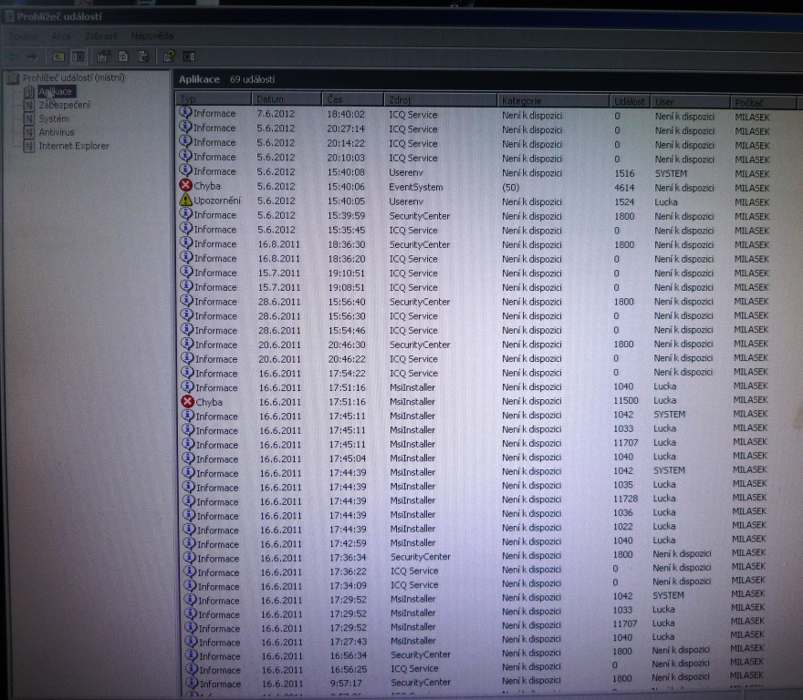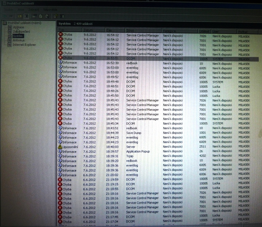 - v Prohlížeči událostí jsem něco našel, ale mě to nic neřekne, tak přikládám obr. kdyby někdo věděl
