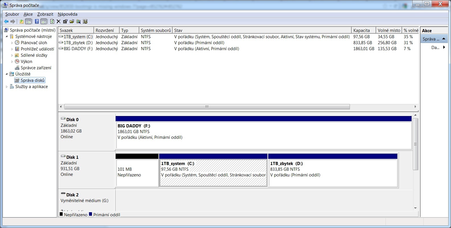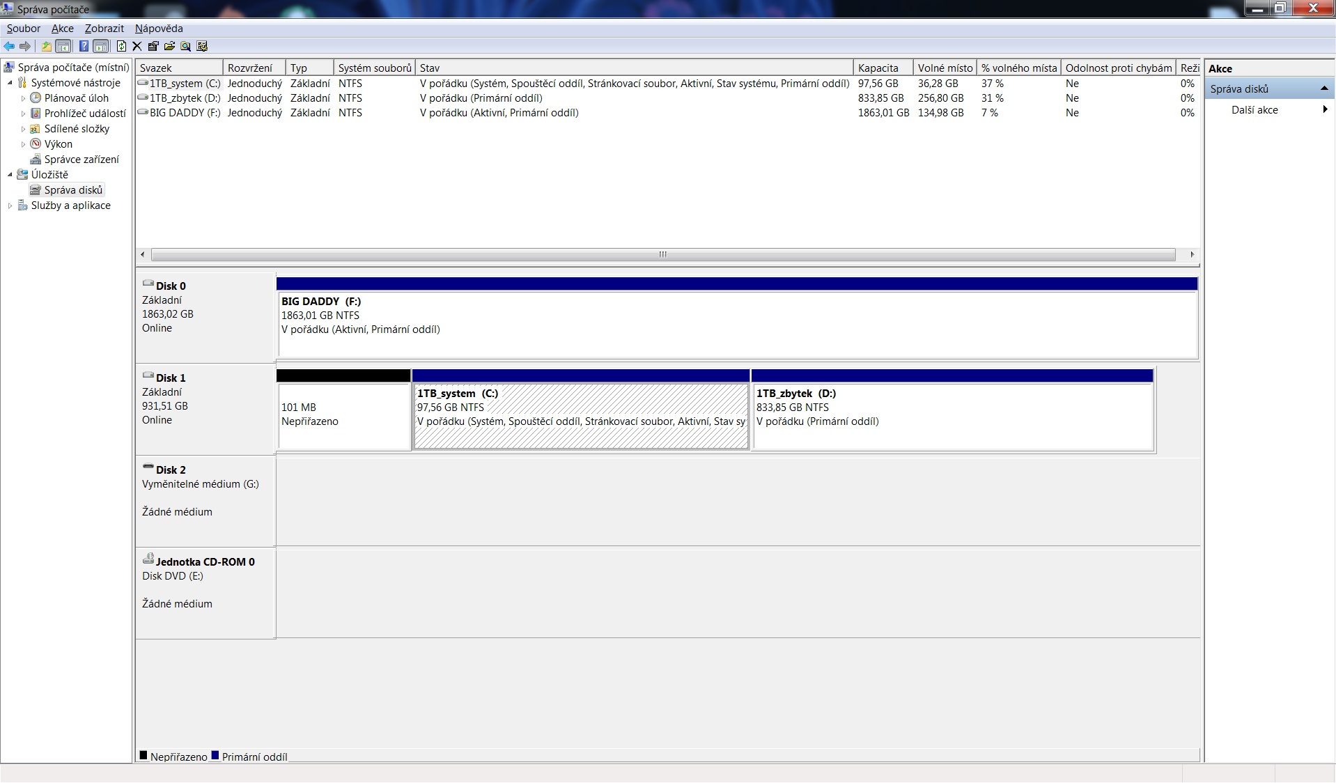 - počet fyzických disků 2 - "Disk 1" je rozdělen na 3 části = na systém, na osobní data a pak 100 Mb…