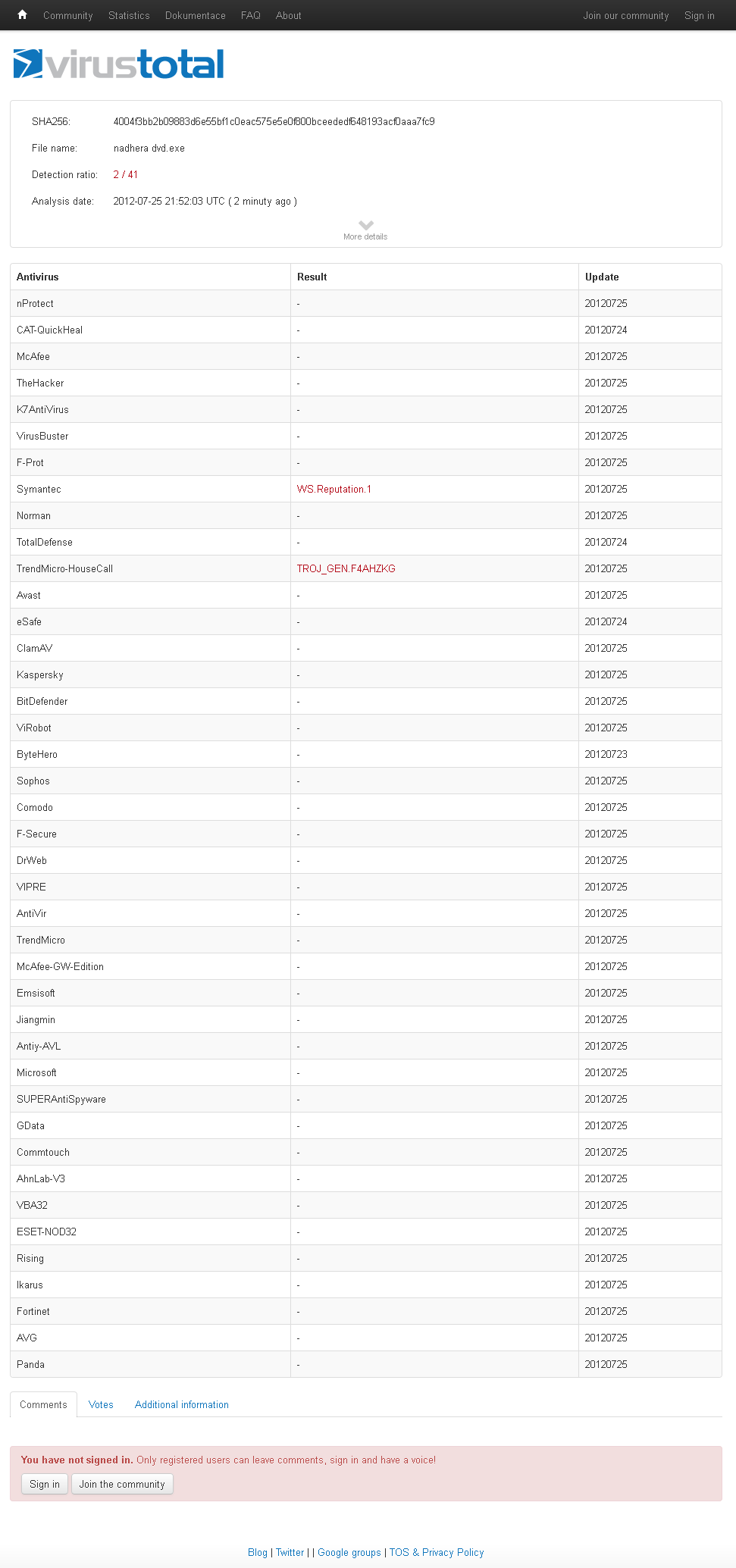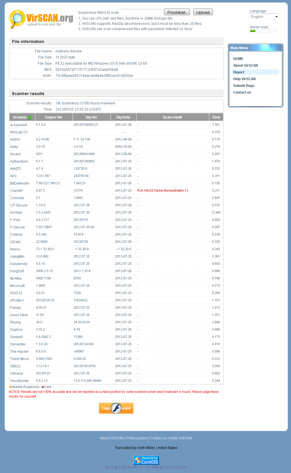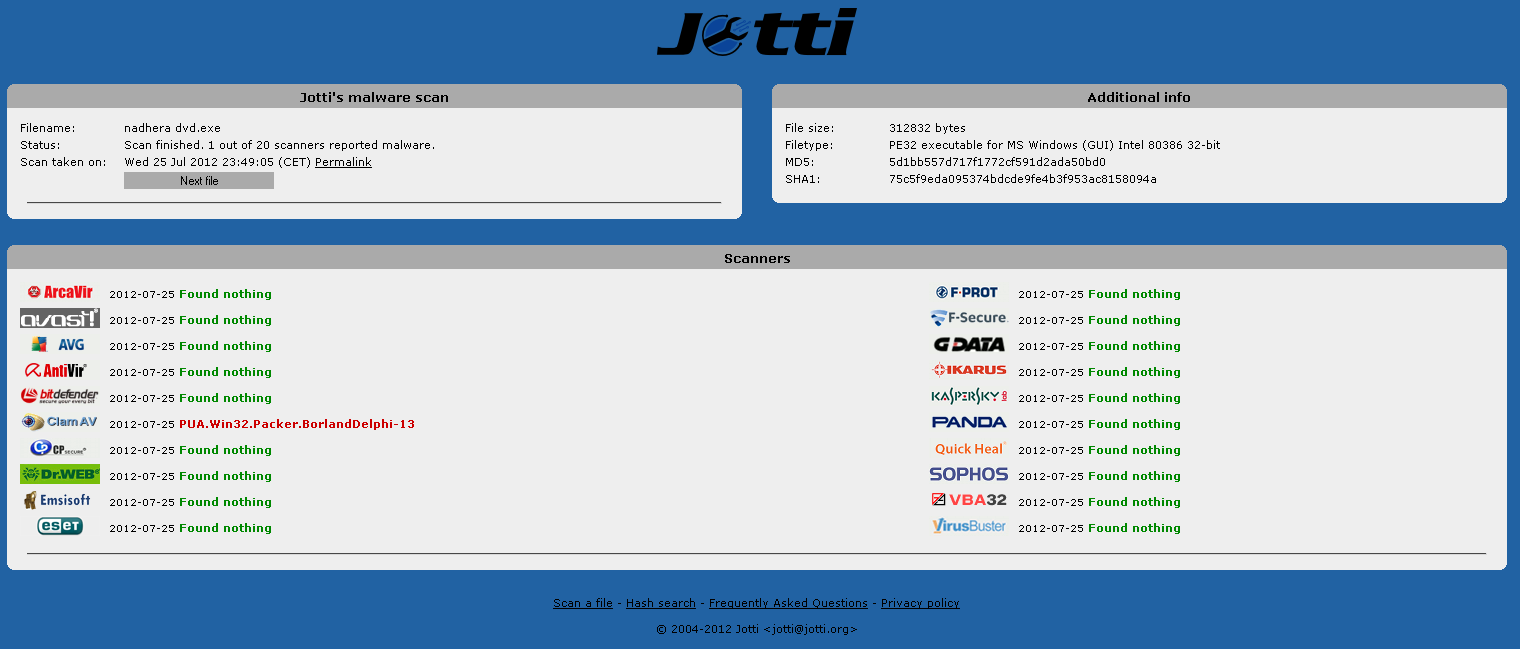 Ehm, velikost souboru 134.59KiB, ClamAV křičí cosi o "PUA.Win32.Packer.BorlandDelphi-13", no skvělé...