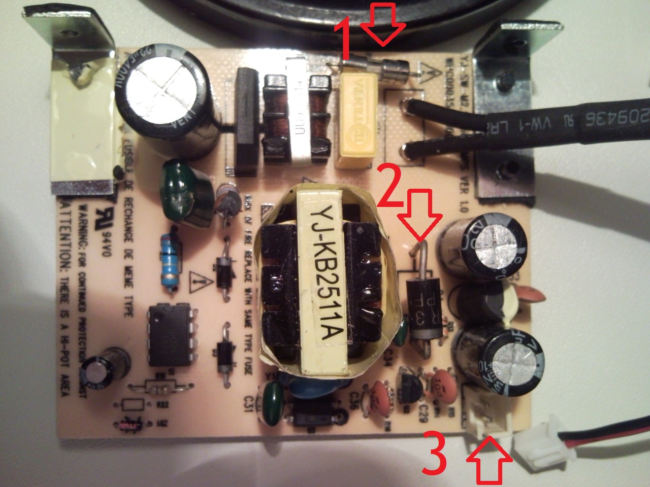 Bedničky jsem rozebral. (Aby mě nebacily kondenzátory a 220V si pozor dávám.) Pojistka (na obrázku označeno číslem 1) je dobrá. Ale na výstupu (na obrázku označeném číslo 3) by mělo asi být 12V, ale je tam jen 1V a to jen na chvília pak se zase ztratí. Měřil jsem diody a našel asi jednu vadnou (na obrazku pod číslem 2) má v obou směrech 14ohm. Může mi tady někdo poradit jak přeměřit další součástky, nebo pokud takový dotaz sem nepatří, nasměrovat někam, kde se řeší tohle. Děkuji.