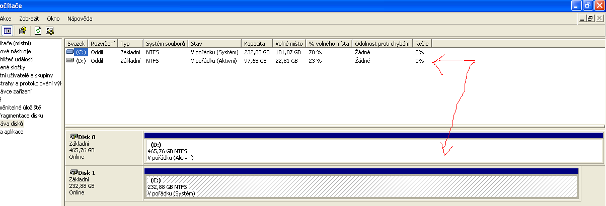 Winxp leta nepreinstaleny, zavirovany, ze nesel net, blokoval exe a blokoval vsechny zname antiviry. Disk 500 GB rozdelen na dva oddily, C a E. C 100 GB, E 400GB. Odzalohoval sem vse na E a reboot do instalatoru WinXp origo. Winy vypalovacka neprecetla, tak sem z druheho PC zamenil vypalovacku a pokracoval. Winy mi po potvrzeni licence F8 ukazali jen jeden oddil-C, 100 GB. Si rikam, kde je E a zruseni instalatoru a restart do zavir. Winu a v Tento pocitac vidim jen C, 100 GB a zbytek fuc. Dam tento pc-spravovat-zarizeni-spravce disku a dole disk0 je 500 GB a modra barvicka partition ukazuje jednu aktivni particnu, jinak nic. Ale okno nahore ukazuje disk oddil 100 GB.